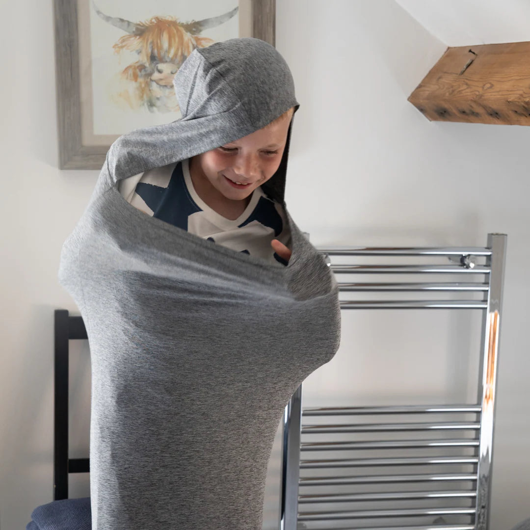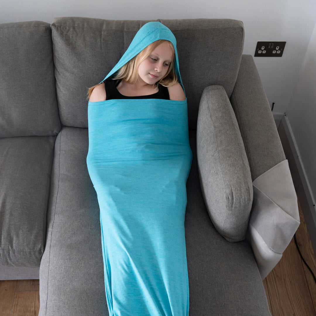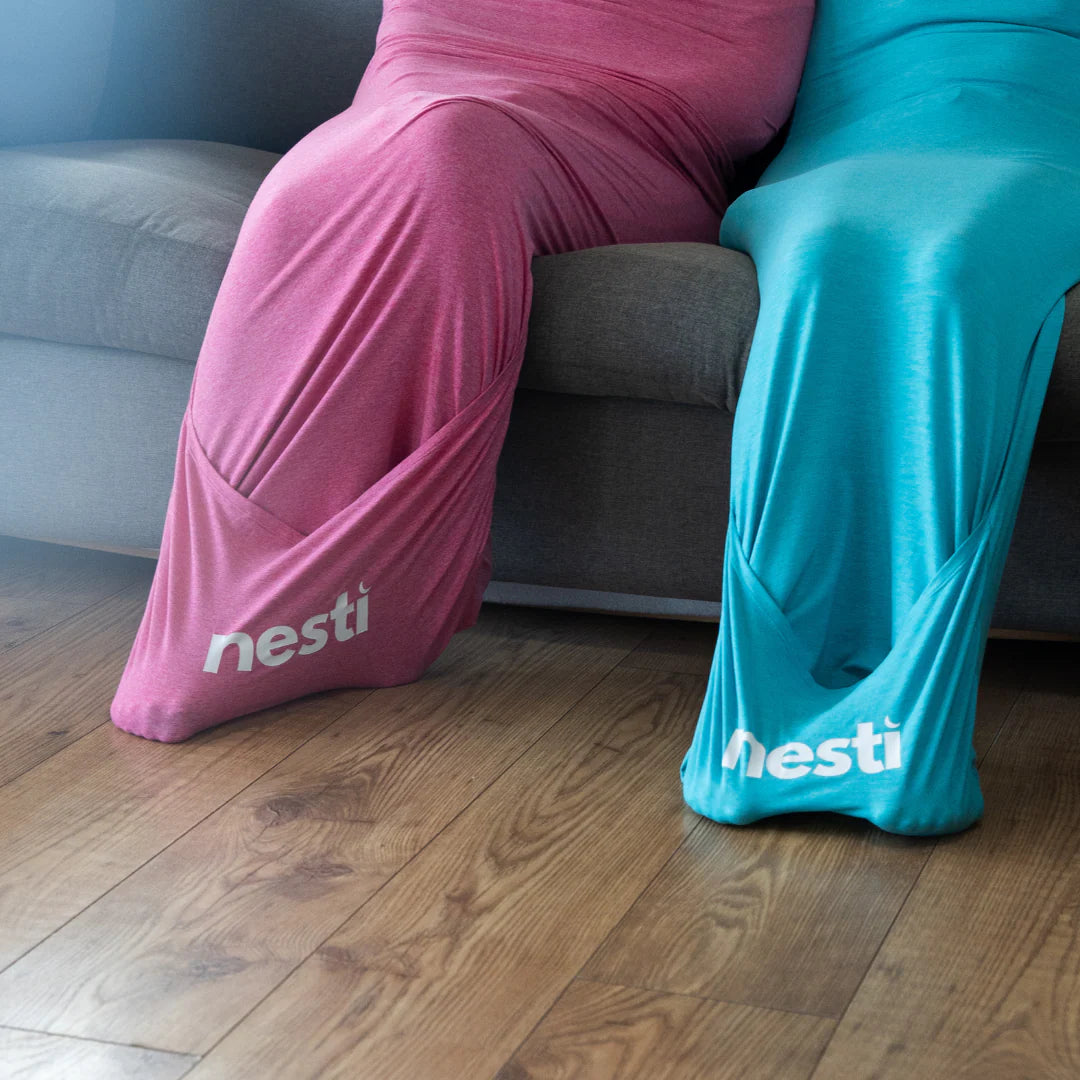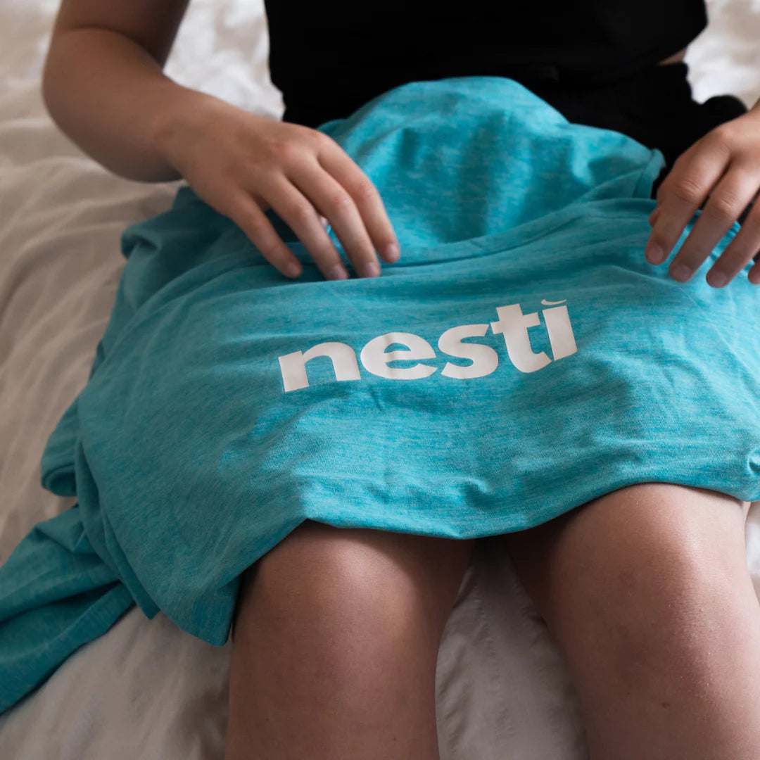 Una vez en la cama, deslícese dentro del Nesti de modo que la costura superior quede en una posición cómoda. Recomendamos colocarlo cerca de la parte superior del pecho y extenderlo hasta los hombros. La tela se estirará y comprimirá, proporcionando una presión relajante alrededor del cuerpo.
